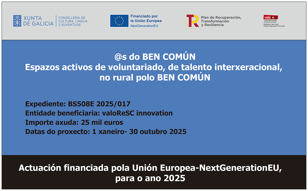 Este voluntariado é un proxecto piloto que ten como fin último a Transformación Social e o Desenvolvemento Comuntario no Rural a través da creación de COMUNIDADES DE TRANSFERENCIA DE COÑECEMENTO E TALENTO NO RURAL. Trátase dun Voluntariado Participativo e Solidario, para un Envellecemento Activo e para o Crecemento vital da nosa mocidade vinculada ao Rural.